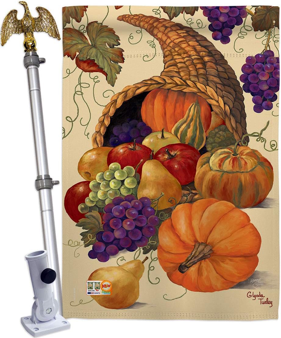 Harvest & Autumn Beautiful Large House Flag, Wooden Flagpole And Bracket – Wall Mount Complete SetBreeze Decor have variety of House Flag Set for all occasions. Uniquely design for hanging indoor or outdoor use. We are committed to offering you exceptional values. Our customers enjoy displaying our House Flag Set for longer periods. Specification: Theme: Harvest & Autumn Size: House Flag Set 28" x 40" Size: 57" 2 Pieces Wood Pole With Adjustable Angle Flag Bracket Print: Double-Sided Readable: Readable Both Sides Material: Weather Resistant 3 Layers Blockout Stitching: Double Stitched Display: Vertical Hang Type: Sleeve Artist: Glynda Turley Special Features: Origin: Made In USAPackage Include: 1 pc x Large House Flag 28" x 40" 1 pc x 57" 2 Pieces Wood Pole Solid Brass Screw Joint 1 pc x Adjustable Angle Wall Mount Flag BracketFor more than a decade, we’ve been dedicated to manufacturing flags with no comparison in quality and beautiful designs. Our flags are made with our Pro Guard material that is soft to the touch and designs can be read correctly on the flag. A feature that our customers will love. We are committed to using eco-friendly inks that won’t leave a foot print in our environment. MPN: BD-HA-HS-113041-IP-BO-D-US12-PL 13041 63041
