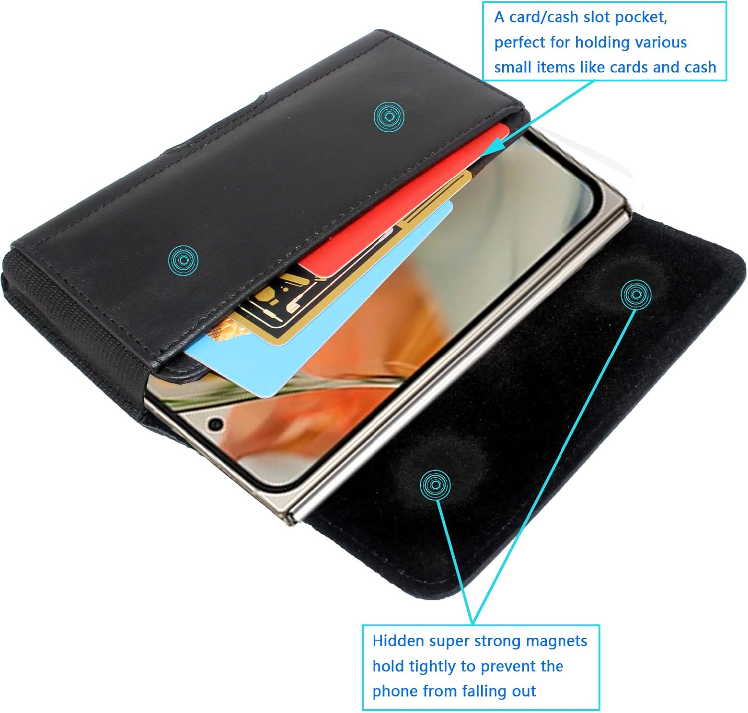 Woluki Holster for Google Pixel 10 Pro Fold, Phone Belt Case [Built-in Card Slot], Belt Loop,Belt Clip,Magnetic Closure Pixel 10 Pro Fold Leather Horizontal Phone Pouch 1.This horizontal belt phone pouch is designed for the google pixel 10 pro fold. 2.The elegant phone holster made of leather materials with durable elastic bands, which not only shows a stylish and unique texture, but also protects your phone from scratches and damage. 3. Leather cell phone holster built-in a card slot,also known as an cessory slot conveniently store credit cards, cash, ID, Keys; This card slot is designed to be the same width as the main pocket of the waist bag, making everything blend in seamlessly. 4. This phone waist pack has a sturdy metal belt clip and two belt loops on the back. You can quickly snap it on or off your belt with the clip, or run your belt through the loops--super secure, no need to stress about it falling off. It’s perfect for camping, hiking, biking, and all your outdoor adventures. 5.The highly-efficient sturdy magnetic cover can be opened and closed safely, with an elastic band on the side to protect your phone more securely. The opening at the bottom allows you to push your phone up faster take out your phone more easy. 6.This waist pack is not suitable for use when the phone is already fitted with a protective case.