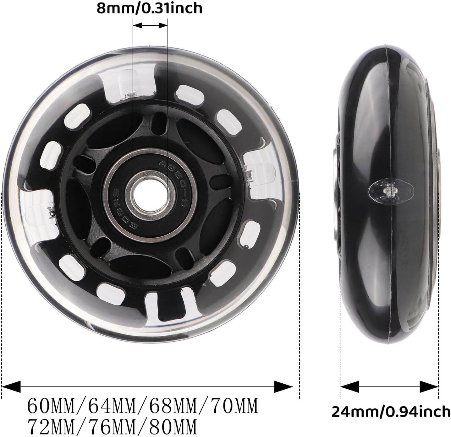 Light up your skating experience with these vibrant inline skate replacement wheels! Available in multiple sizes from 60mm to 80mm, these universal-fit wheels feature high-quality ABEC-7 bearings and durable 85A polyurethane construction - perfect for both indoor and outdoor skating. The smooth-rolling wheels come equipped with built-in LED lights that illuminate while skating, adding both style and visibility to your ride. With a load capacity of 20kg per wheel and precision engineering, these wheels deliver reliable performance for recreational inline skating. The 85A hardness rating provides an ideal balance between grip and speed, suitable for various skating surfaces. Each wheel features a sleek design with a smooth exterior finish and comes in eye-catching colors including pink, black, and blue. Installation is straightforward with a standard 0.75-inch bore diameter. These wheels are an excellent choice for upgrading your inline skates or replacing worn wheels to maintain optimal performance.