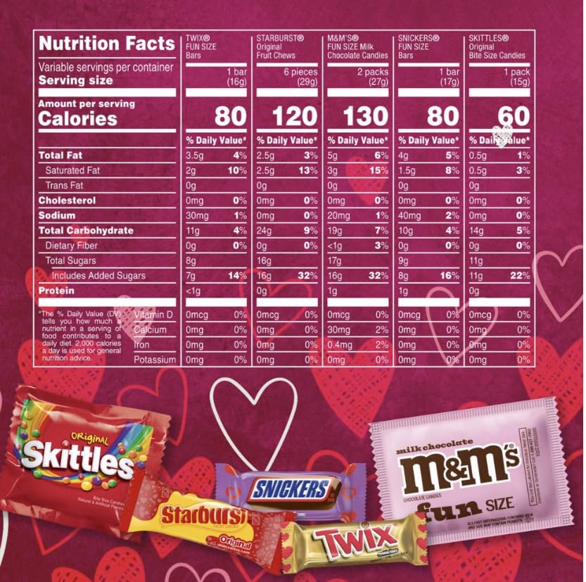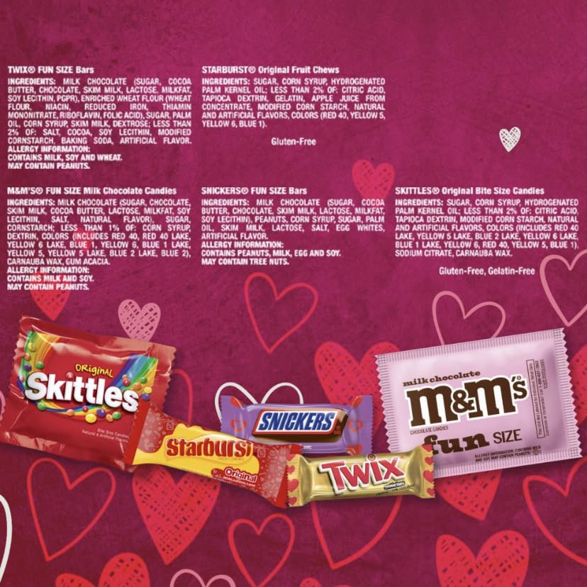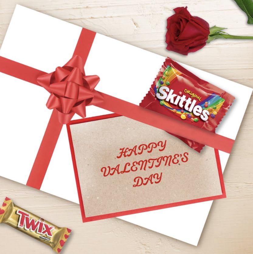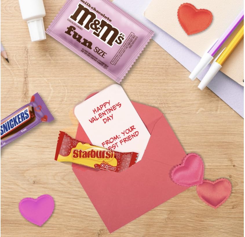 Variety is perfect for Valentine's Day! Our M&MS, SNICKERS, TWIX, SKITTLES, and STARBURST Valentine's Day Variety Candy Bag is a delicious way to say 'I love you' to those who matter most. Each bag is filled with 80 individually wrapped milk chocolate and fruity classics . Ideal not just for Valentine’s Day party favors or for filling your heart-shaped candy bowls at the office, but also perfect for creating a delightful and personalized surprise for your loved ones. Each Valentine's Day candy is individually wrapped with 'To' and 'From' on each pack. These Valentine’s chocolates and chewy candies are ready to personalize for all your V-Day exchanges with family, friends, and partners.