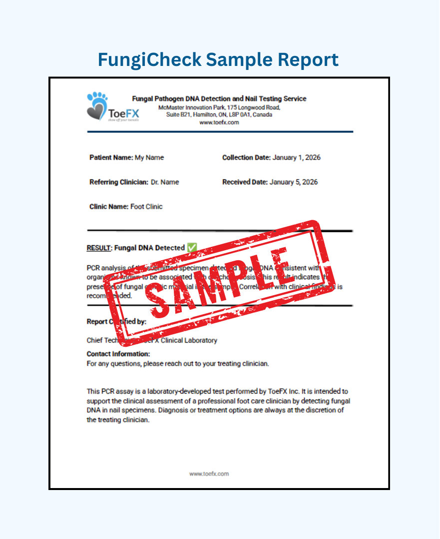 Simply collect nail clippings or dust, carefully transfer them into the provided envelope, and mail it back to ToeFX. Our PCR testing will analyze your sample, ensuring you receive a simple, clear report indicating positive or negative for fungal infection.
